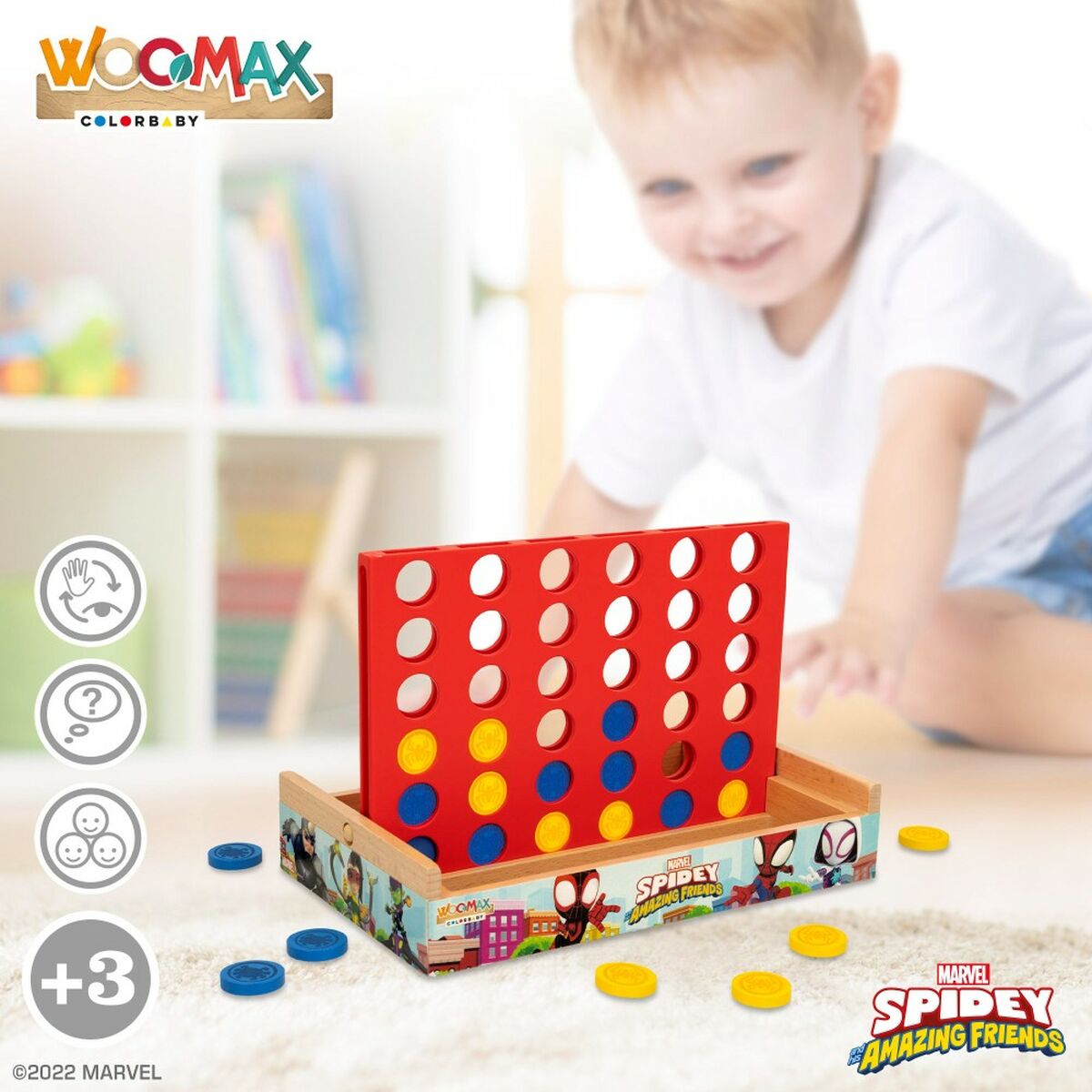 ¡Alinea 4 fichas del mismo color y gana a tu rival con el clásico juego de mesa 4 en raya! Este juguete incluye 1 base de madera con tablero abatible y 18 fichas color amarillo y 18 fichas color azul. Es el juego de toda la vida hecho de madera natural de la colección WOOMAX Spidey y su superequipo, ideal para divertirte con tu mejor amigo. Es un juguete adscrito a la iniciativa “Comparte y recicla”, una acción solidaria de la Fundación Crecer Jugando cuyo objetivo es la recogida de juguetes para su donación a organizaciones benéficas españolas.