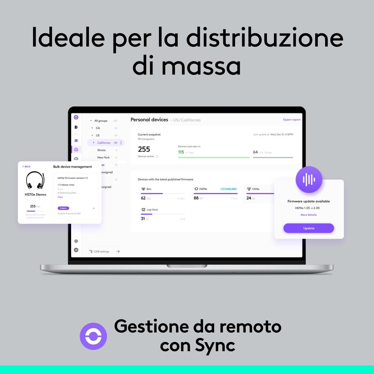 La versión de Microsoft Teams de los auriculares H570e es compatible con Logitech Sync, lo que permite al departamento de TI administrar de forma remota los auriculares y otros dispositivos Logitech. Los empleados también pueden personalizar los auriculares con micrófono de la versión para Teams con Logi Tune para una experiencia personalizada.