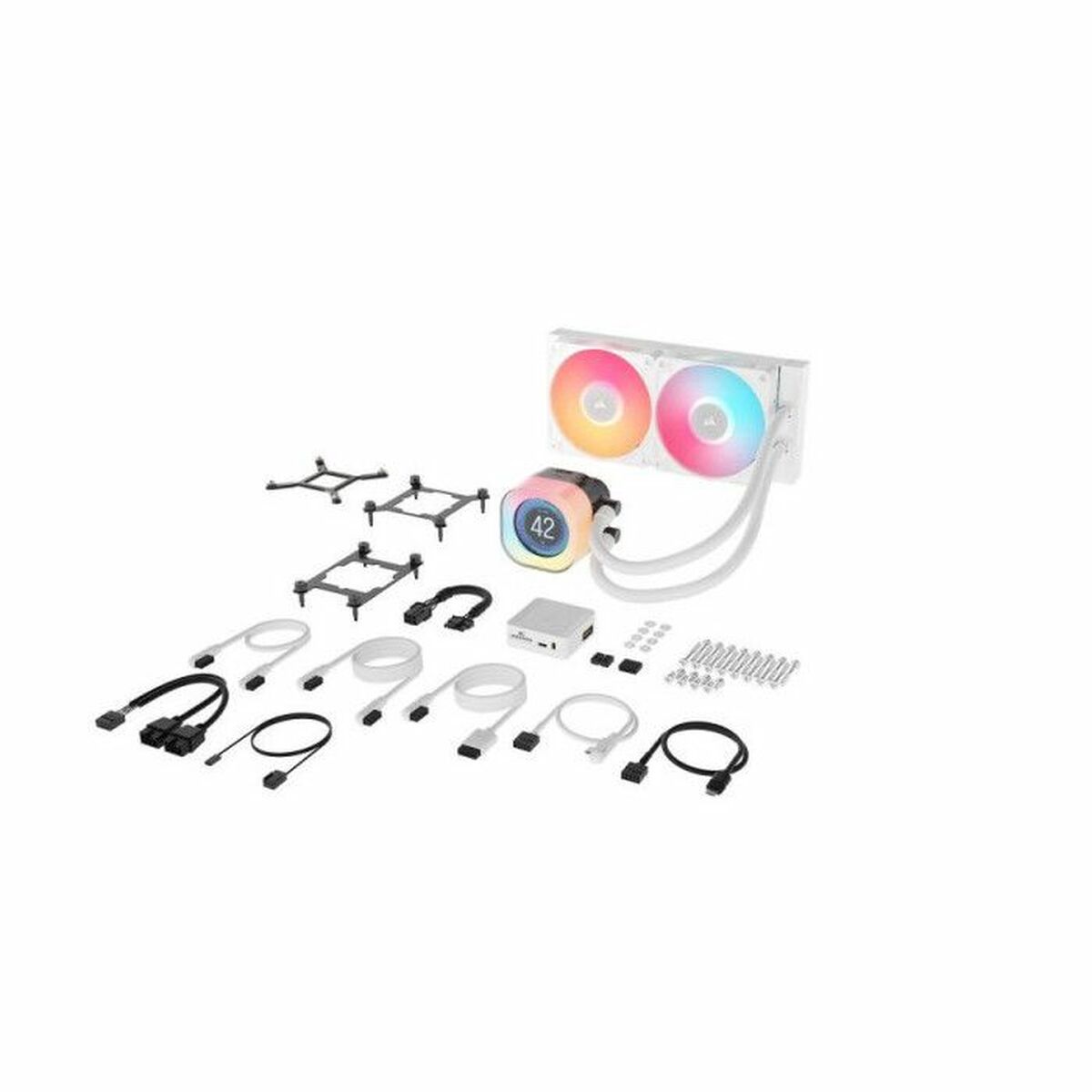 Corsair iCUE LINK TITAN 240 RX LCD. Tipo: Refrigerador de aire, Diámetro de ventilador: 12 cm, Velocidad de rotación (mín.): 300 RPM, Velocidad de rotación (máx.): 2100 RPM, Nivel de ruido (baja velocidad): 10 dB, Nivel de ruido (alta velocidad): 36 dB, Máximo flujo de aire: 73,5 cfm. Ancho: 125 mm, Profundidad: 125 mm, Altura: 275 mm. Color del producto: Blanco