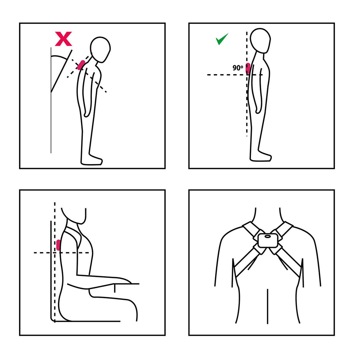 Un entrenador de postura inteligente con un diseño moderno, unisex y de talla única que avisa mediante vibración para corregir la postura cuando se desvía 25º de la posición recta inicial correcta.