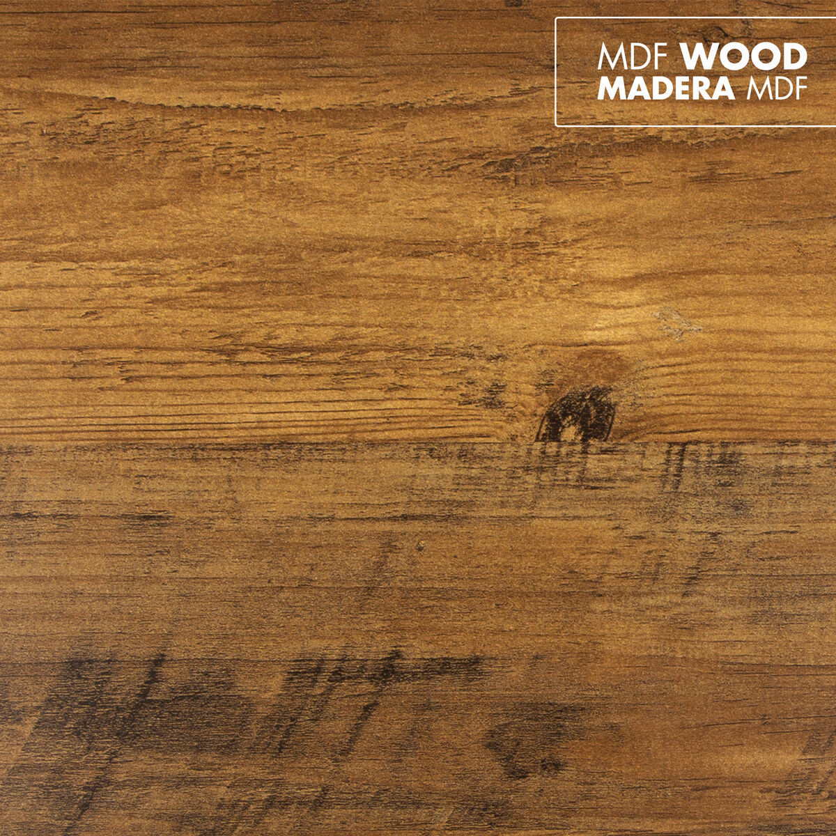 - Diseño esquinero: estructura metálica esquinera negra combinada con tableros en acabado madera natural, con forma triangular que aporta un aire industrial cálido