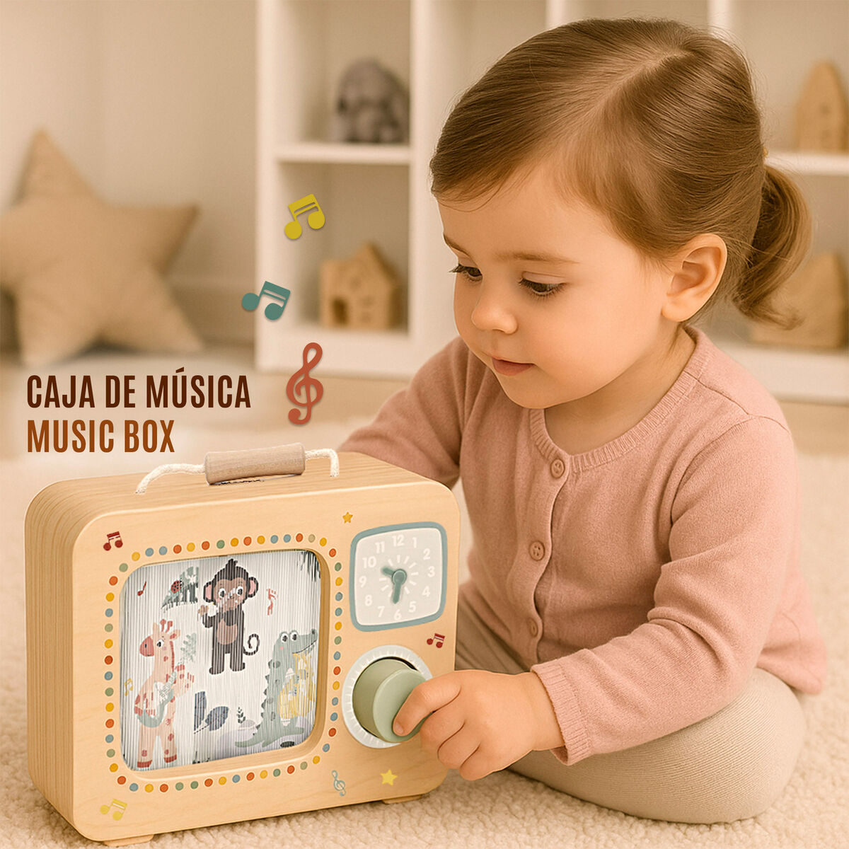 ¡Deja volar tu imaginación con la televisión de madera WOOMAX! Diseñada para niños a partir de 24 meses, este encantador juguete de madera FSC cuenta con un sistema de manivela que hace girar las imágenes de adorables animales como si se tratara de una tele de verdad. Además, incorpora un reloj analógico con agujas móviles para aprender las horas jugando. Con su asa superior, los peques podrán llevarla fácilmente a cualquier parte y dejar volar su imaginación.