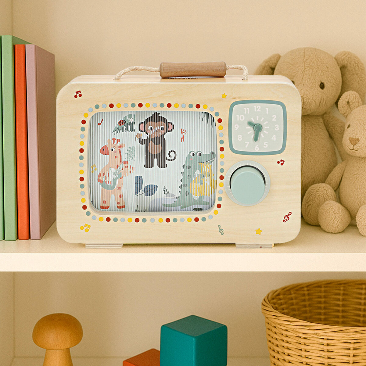 - Diseño encantador: televisión de madera interactiva con ilustraciones de animales y colores suaves