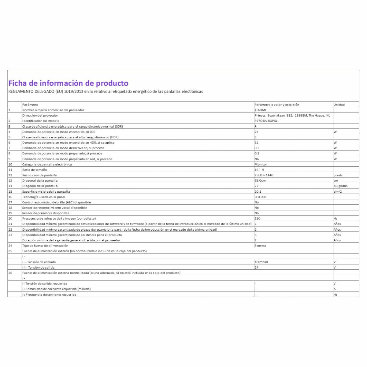 Xiaomi Monitor G27 Pro. Diagonal de la pantalla: 68,6 cm (27″), Resolución de la pantalla: 2560 x 1440 Pixeles, Tipo HD: Wide Quad HD, Tecnología de visualización: LED, Tiempo de respuesta: 1 ms, Relación de aspecto nativa: 16:9, Ángulo de visión, horizontal: 178°, Ángulo de visión, vertical: 178°. montaje VESA, Ajustes de altura. Color del producto: Negro