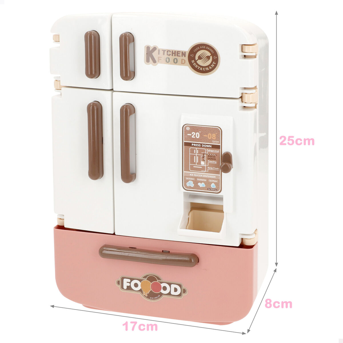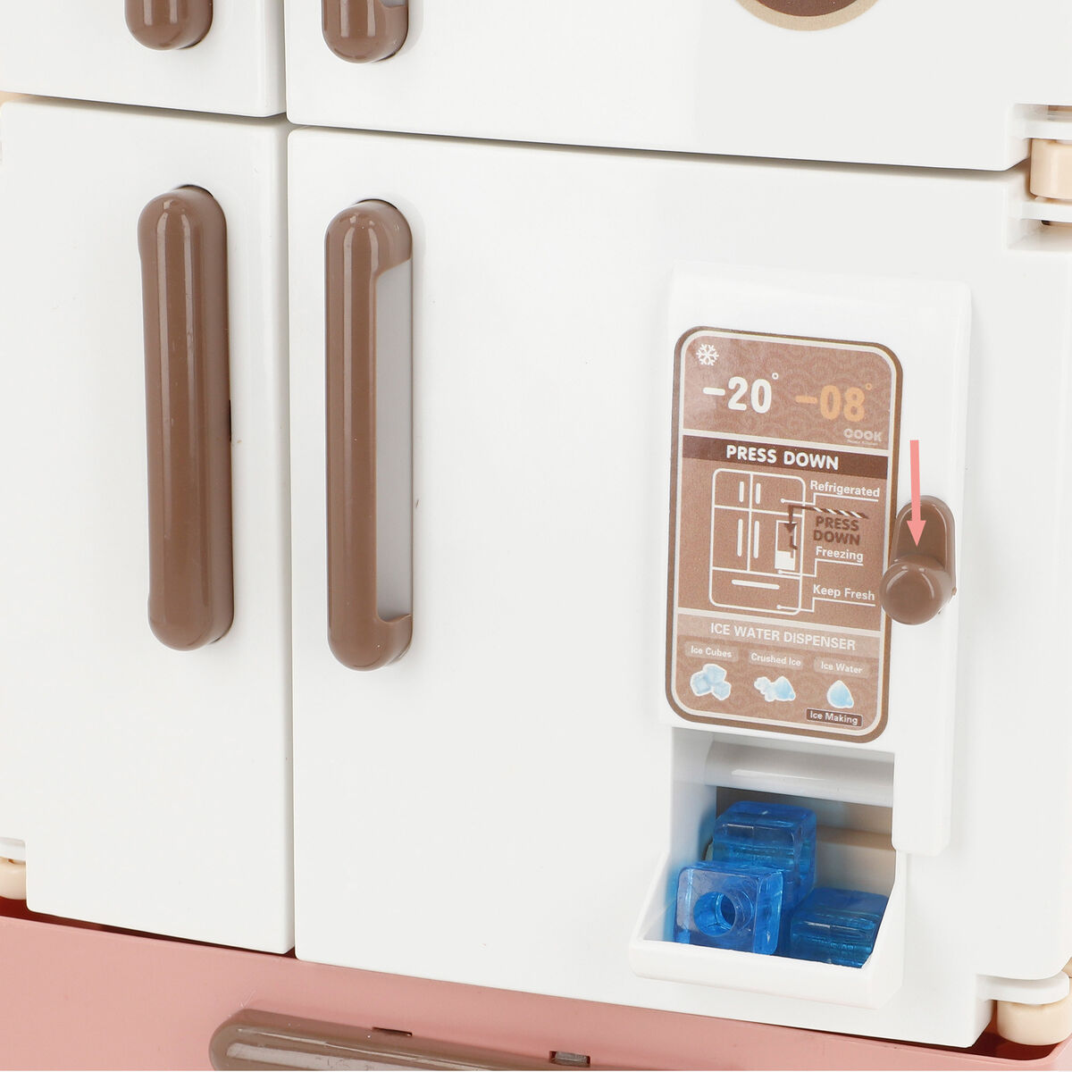 - Luces y sonido: el mini frigorífico cuenta con luz y sonidos para mejorar así la experiencia, haciendo este electrodoméstico más realista (funciona con 3 pilas AA, no incluidas)