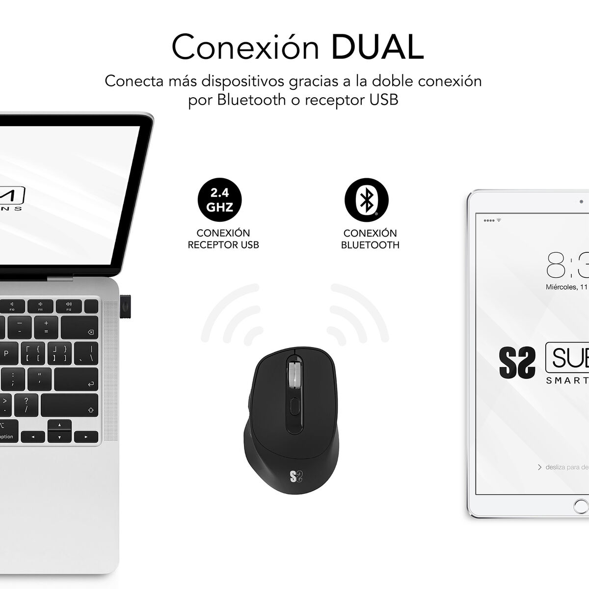El ratón óptico SUBMO-EDCON01 de Subblim es un dispositivo diseñado para ofrecer una experiencia ergonómica avanzada y un alto rendimiento en entornos profesionales y domésticos. Su diseño ergonómico con apoyo para el pulgar reduce la fatiga y previene lesiones, adaptándose cómodamente a manos de tamaño mediano y grande, lo que facilita una postura natural y un control preciso del cursor. Presenta una estética moderna en color negro con laterales revestidos en goma antideslizante que aseguran un agarre firme incluso tras usos prolongados. En términos de conectividad, ofrece una doble opción mediante Bluetooth de última generación y receptor USB-C para radiofrecuencia, permitiendo conectar hasta tres dispositivos simultáneamente y alternar entre ellos con facilidad para una mayor versatilidad. Su sensor óptico ajustable con resolución máxima de 2400 dpi garantiza un seguimiento fluido y preciso en múltiples superficies, adaptando la precisión según las necesidades del usuario. Este modelo incorpora seis botones con tecnología Silent Click que minimizan el ruido al hacer clic, siendo ideal para ambientes silenciosos como oficinas o espacios de estudio. La rueda de desplazamiento es metálica y antideslizante, con un tacto confortable que mejora la experiencia de navegación. Además, cuenta con una batería recargable de 500 mAh tipo Li-ion que proporciona una autonomía prolongada sin necesidad de pilas y la posibilidad de continuar usando el ratón mientras se recarga vía USB-C. Está optimizado para sistemas Windows y Mac OS, lo que refuerza su compatibilidad con una amplia gama de dispositivos. El conjunto de características hace del Comfort Ergo Dual Mouse un ratón completo, ergonómico y funcional, adecuado para usuarios exigentes que buscan confort, precisión y flexibilidad en su dispositivo de entrada.