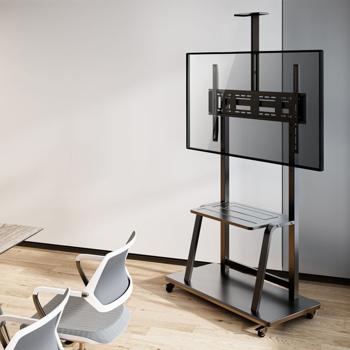 AISENS® – Soporte de Suelo ECO con Rueda, Bandeja para DVD y Soporte de Cámara para Monitor/TV 150Kg de 37-100, Negro